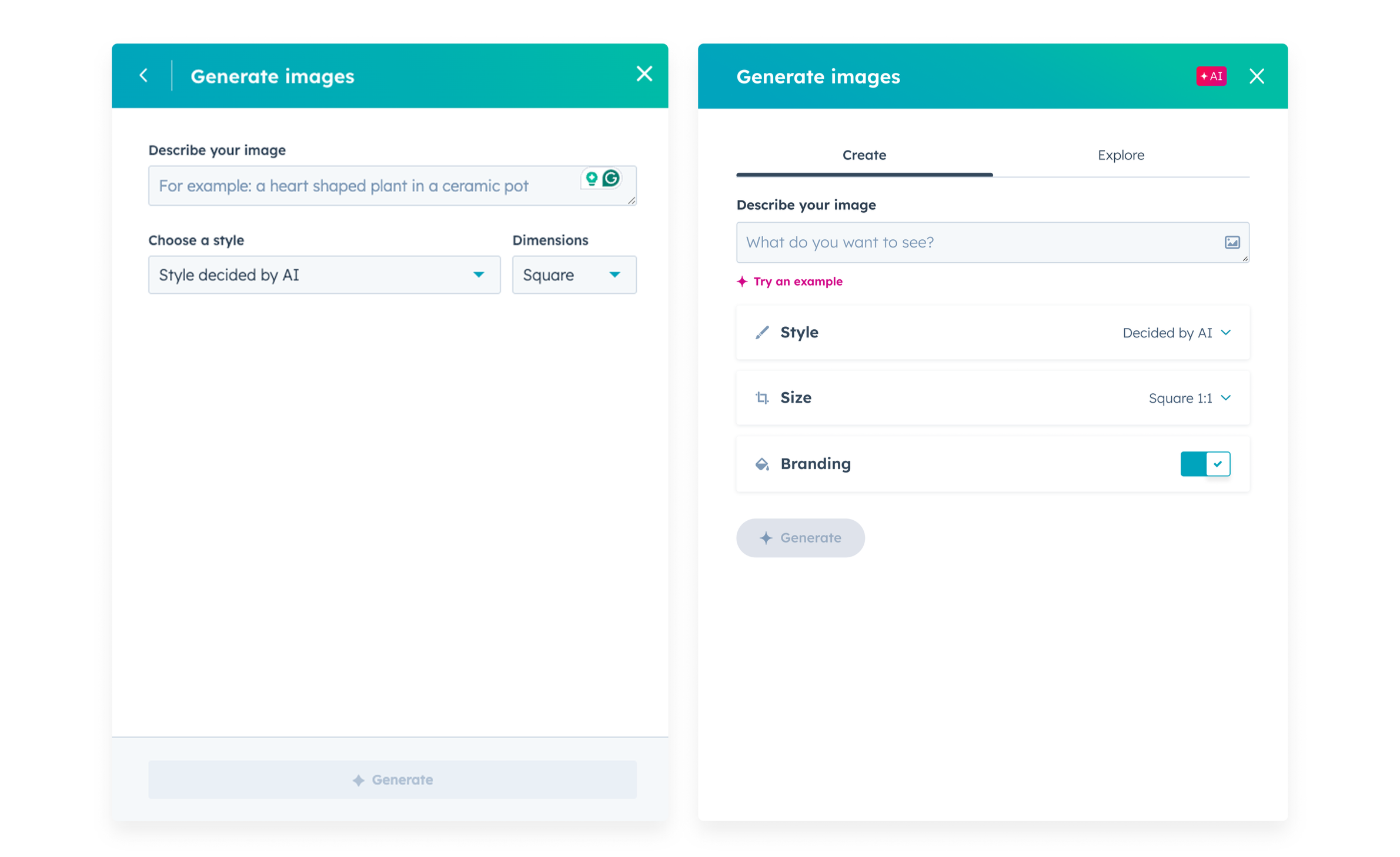 I led the end-to-end redesign of HubSpot’s AI Image Generator to transform it from a standalone experiment into a reliable, cross-platform creative tool. By focusing on quality, guidance, and seamless integration, we bridged the gap between user intent and AI output, increasing engagement, conversion, and trust in AI-generated media.